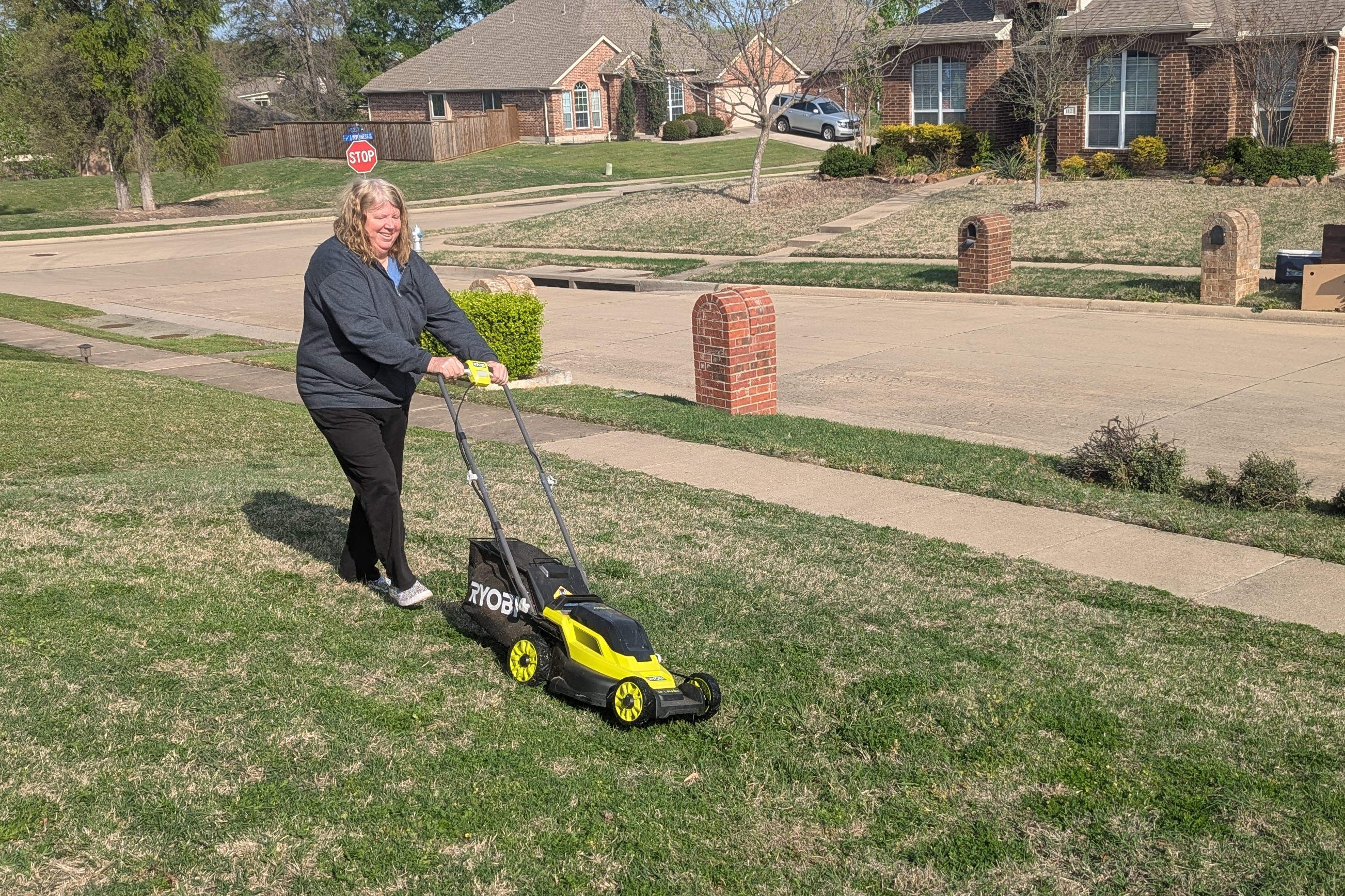 ◱ Lois uses her new lawn mower.